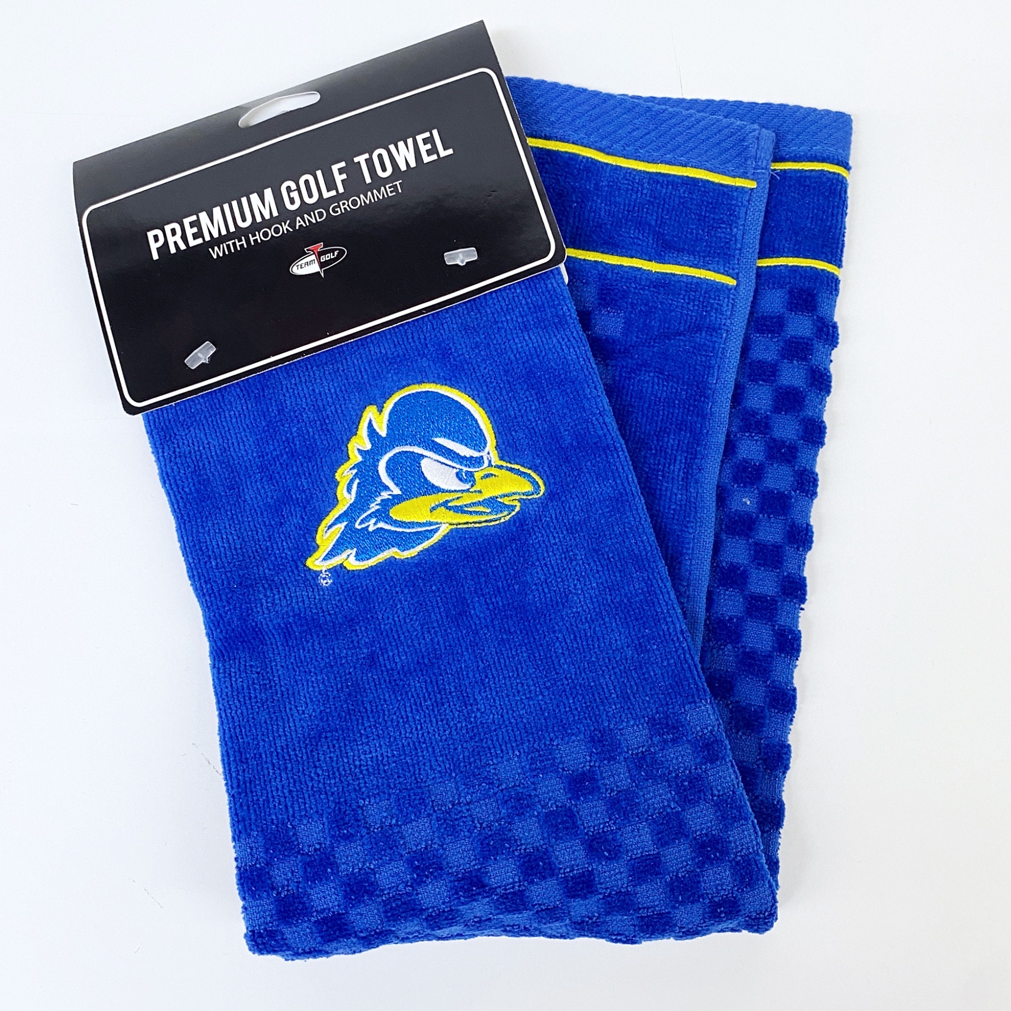 University of Delaware Blue Hens embroidered golf towel made of sheared 100% cotton velour. Towel is finished with a black swivel hook and grommet to easily attach to any golf bag.